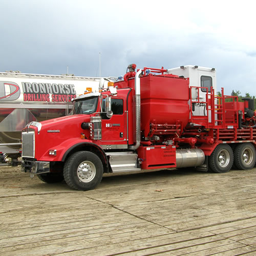 This unit is a truck mounted single cement pumping unit as used in well drilling/service industry. The unit is a custom built oilfield, single pump cement unit powered by one diesel engine. The chassis engine is dedicated to driving the truck and the unit’s triplex pumping package and the unit’s hydraulic system. The unit can be used for a wide variety of fluid pumping operations such as well cementing and pressure testing.